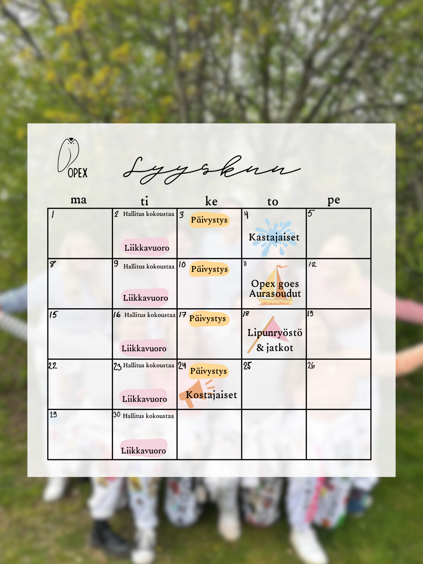 Watch the upcoming events here and make a note of the dates! The list of events is updated regularly and events may change along the way. You can always get more detailed information about events from Monday Mails. Please note that the calendar usually has the Finnish names of the events.