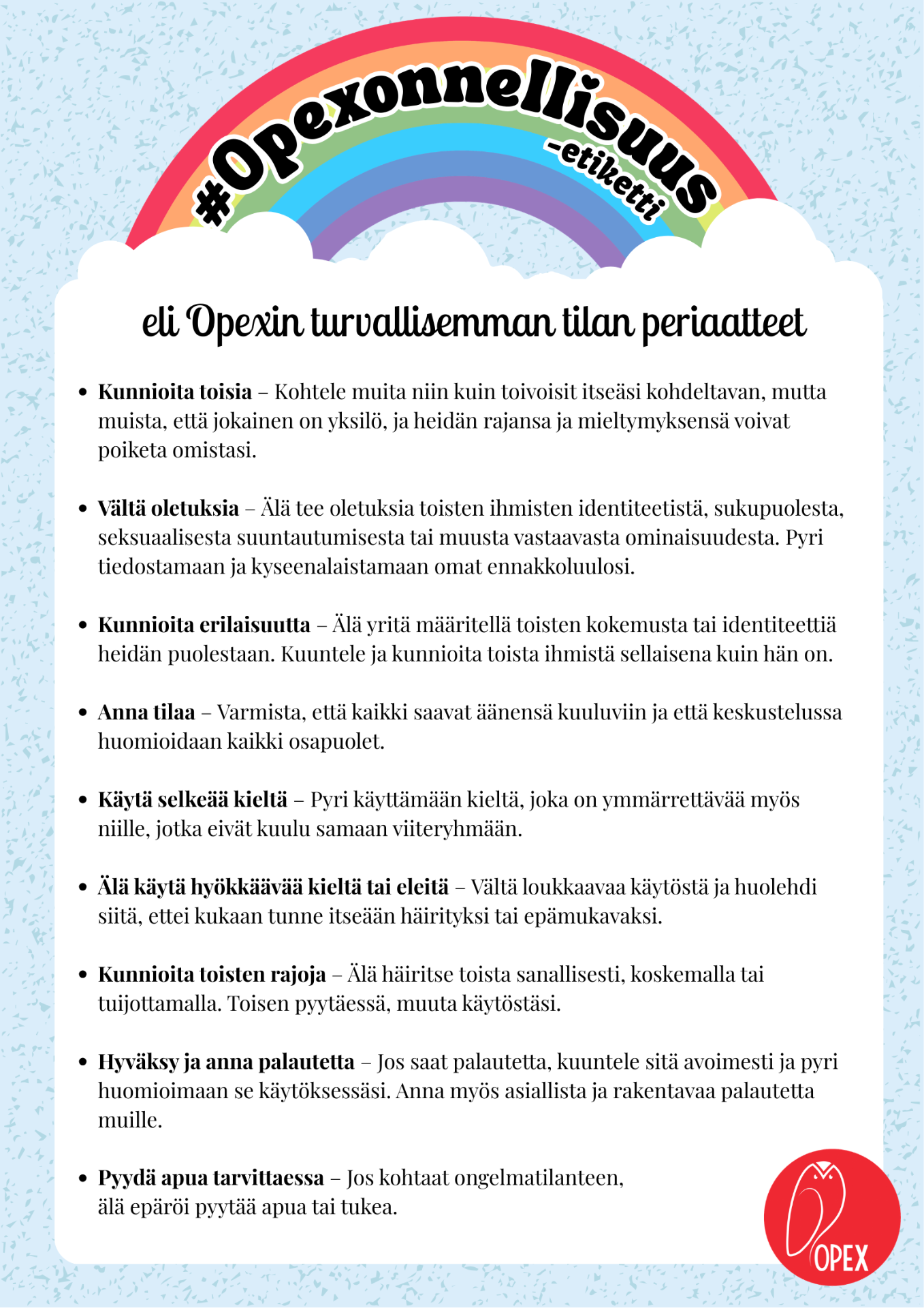 Jokaisessa Opexin tapahtumassa noudatetaan #Opexonnellisuus-etikettiä eli Opexin turvallisemman tilan periaatteita. Lue, sisäistä, noudata!